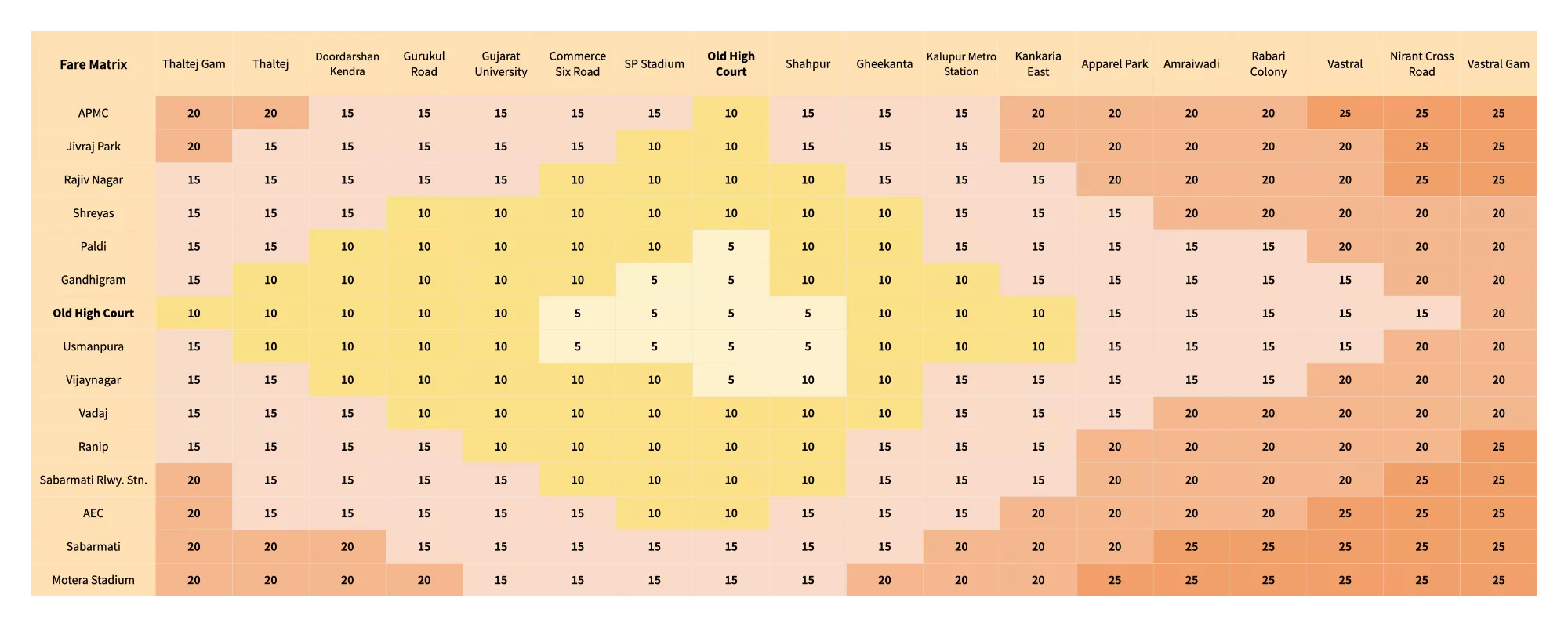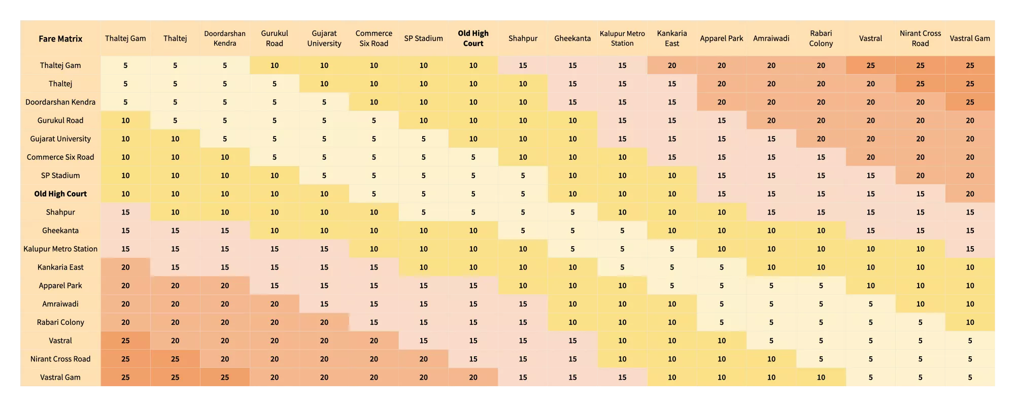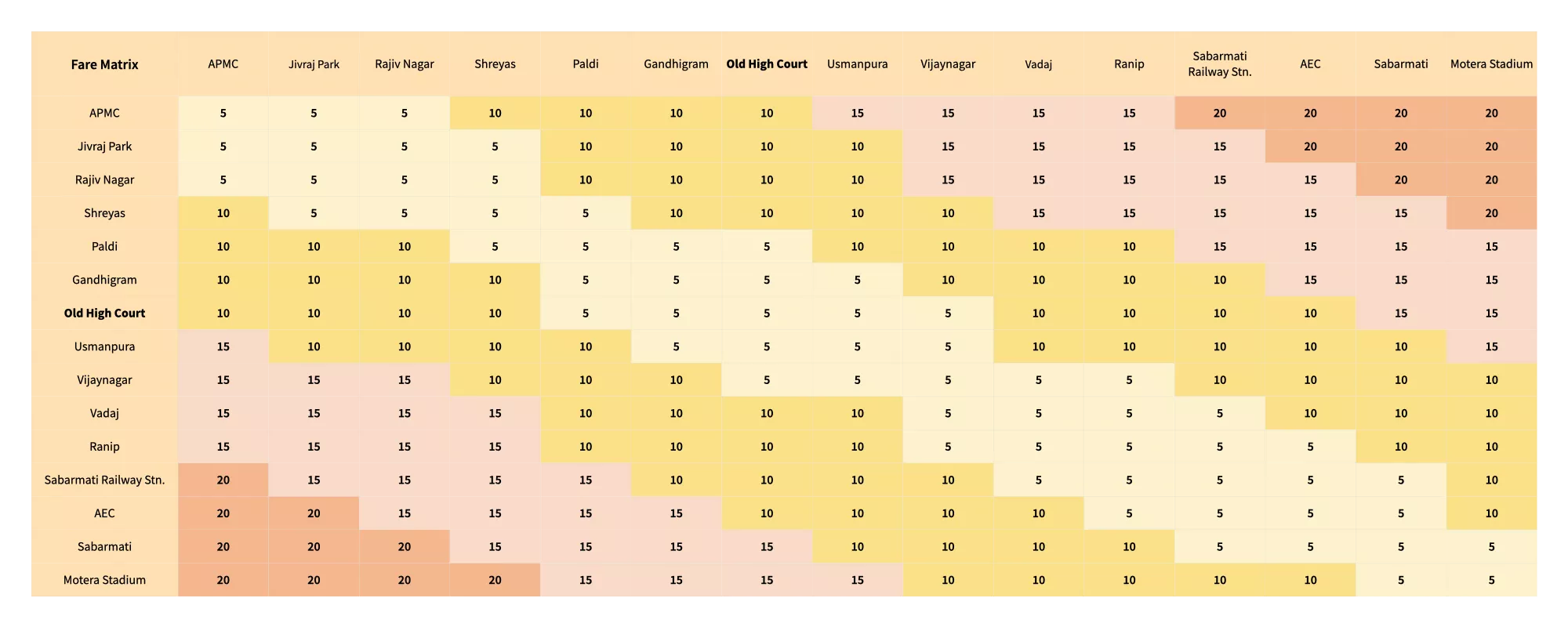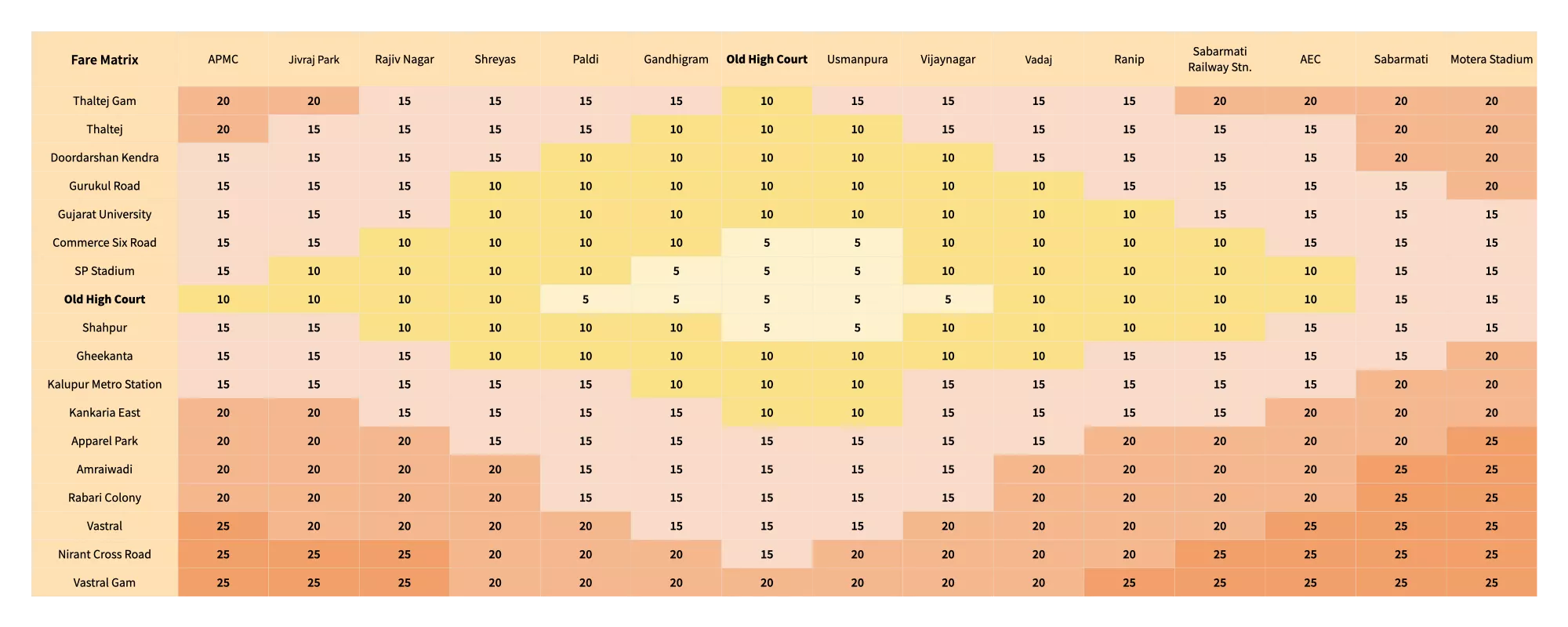 You can find the entire route fare matrix below. The chart below shows the route fare from every station between Thaltej and Vastral Gam.